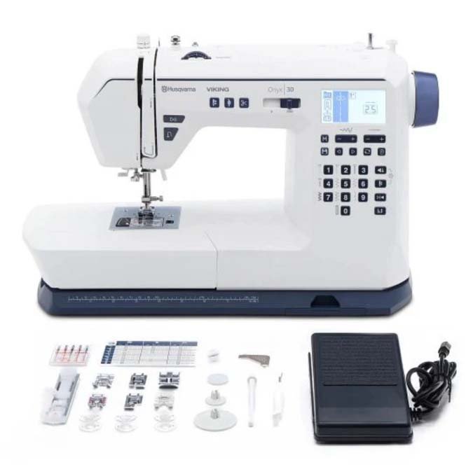 Šijací stroj Husqvarna Onyx 30 je moderný elektronický šijací stroj s LCD displejom, 150 šijacími stehmi, 2 abecedami, 9 druhmi automatickej gombíkovej dierky, veľkým šijacím priestorom, manuálnym nastavením prítlaku pätky, automatickým odstrihom nite, navliekačom.