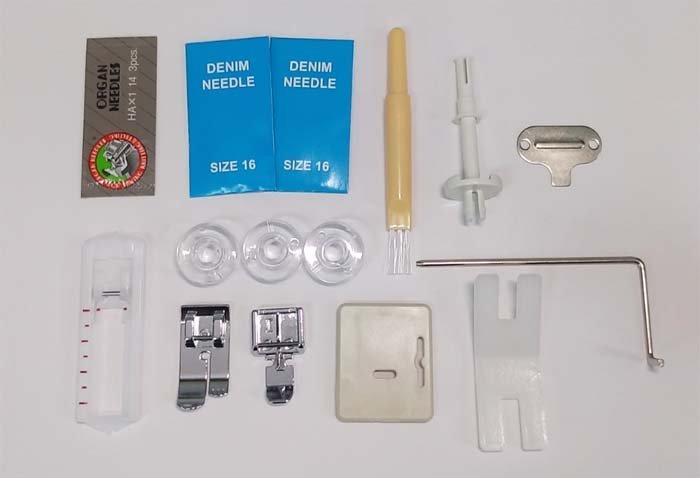 Stroj sa dodáva v kvalitnej fotografickej krabici, ktorá je vhodná aj ako darčekové balenie as bohatým príslušenstvom, ku ktorému patrí napr. pätka na šitie gombíkových dierok, zipsová pätka aj sada ihiel na šitie džínsoviny.
