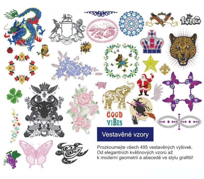 - 495 vyšívacích vzorov v pamäti stroja (kvetinové, dekoratívne emblémy, grafitti, quiltovacie výplne, niekoľko druhov monogramov)