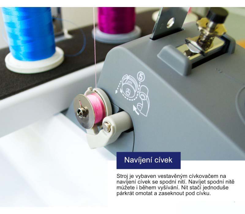 - integrovaný navíjač cievok spodnej nite + možnosť používať predvinuté cievky