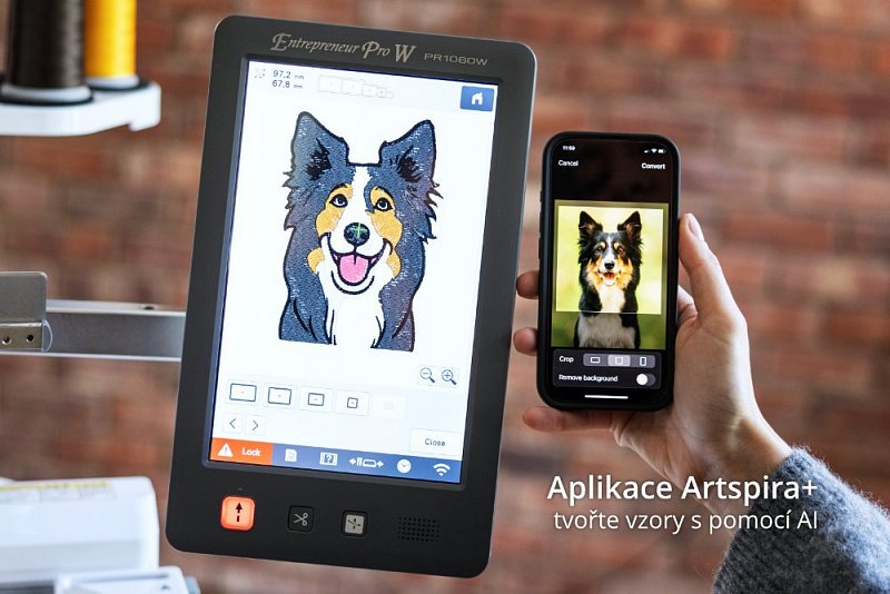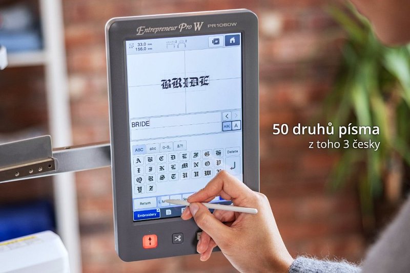 Špičkový desaťihlový vyšívací automat s vyšívacou plochou 360x200mm, funkciou kamery pre skenovanie a pozicovanie, komunikuje po slovensky, má české písma v pamäti a vie tvoriť vzory priamo v stroji